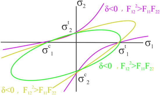 Equation (3) indicates that repeated indices are not summations but individual diagonal members within the tensor matrix. Figure 6 illustrates the inequality (Equation (3)). This inequality ensures that failure will intersect each axis of the shear stress diagram without generating a hyperbolic function. For UD composite materials, a characteristic parameter (δ) is used for this type of material: (). When , as shown in Figure 6, it indicates that some laminate properties in the laminate do not meet the conditions required for a UD composite ply, and in such cases, some plies result in negative .