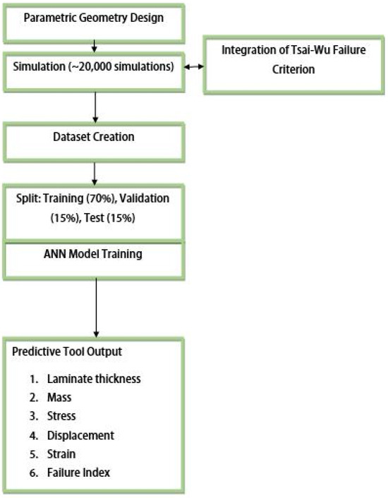 An illustration of the algorithm for developing a machine learning model for a predictive tool is shown in Figure 7. The diagram presents the key steps: parametric geometry design, database generation through high-fidelity simulations, training of artificial neural networks, and integration of the Tsai–Wu failure criterion. The resulting model enables the rapid and accurate prediction of structural performance based on input parameters.