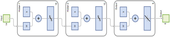 The ANN model is set to be a feedforward neural network (FFNN). This neural network represents a multilayer perceptron (MLP), where data propagates through multiple layers of neurons, including input layers, hidden layers, and the output layer. The hidden layers consist of multiple neurons that process the input data before passing it to the subsequent layer. Regarding the transfer function, an appropriate activation function is automatically selected for each layer of the neural network. These are typically sigmoid functions, hyperbolic tangent sigmoid functions, or linear functions. The type of network employed is a feedforward backpropagation network. Backpropagation occurs from the output layer to the input layer, calculating the gradient of the error function for each weight coefficient using the chain rule. Unlike the original direct approach of calculating the gradient for each layer separately, this backward flow of error information allows for efficient gradient computation one layer at a time. The transfer functions calculate the layer’s output based on its net input. This function receives an input matrix M with dimensions S × Q (where S is the number of neurons in the layer and Q is the number of variables), representing the network’s input vectors. The transfer function transforms each element of matrix M so that the output falls within the range of −1 to 1 [27].