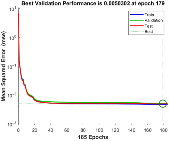 The diagram indicates that the error decreases as the number of epochs increases. The decrease in mean-squared error over the training epochs indicates the model’s progressive learning and improvement in prediction accuracy. Monitoring this metric allows for early stopping to prevent overfitting and ensures that the trained network generalizes well to unseen data. Lower mean-squared error values suggest high predictive capabilities of the neural network, demonstrating its efficiency in linking input variables to their corresponding outputs.