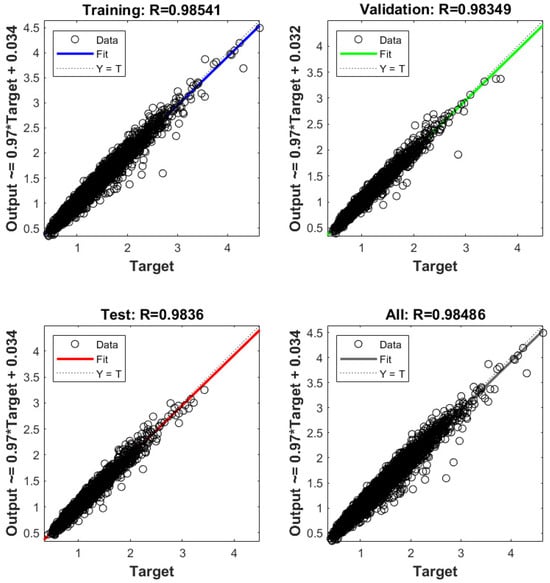 In addition to evaluating the mean-squared error, the model’s regression was also considered. The regression of the artificial neural network model is presented in Figure 10. The coefficient of determination, R2, was used to evaluate the model, where its squared values tend towards 1, indicating a strong correlation between the network’s predictions and the input data obtained from repeated FEA calculations. The solid line indicates the best linear regression between the output and target values. The complexity of the model also affects its predictive performance, but both the mean-squared error and the coefficient of determination confirm the high accuracy of the proposed model.