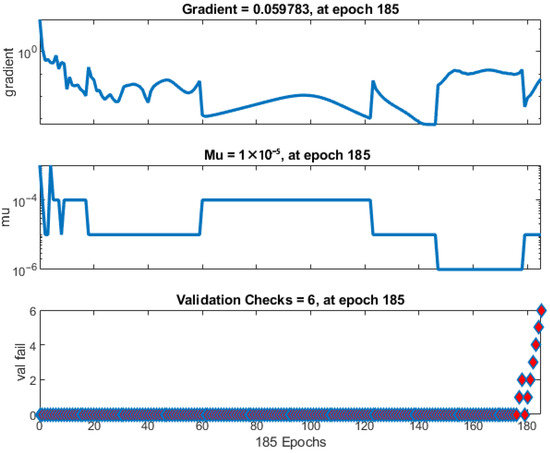 The gradient size, momentum updates (Mu), and the number of validation checks per epoch were used to track the progress of the neural network training process (Figure 11). Mu is an adjustment parameter used in the optimization process to avoid local minima. The diagram for Mu versus epochs shows the model’s stabilization during training. The gradient fluctuates during learning, but as the number of epochs increases, the losses decrease.