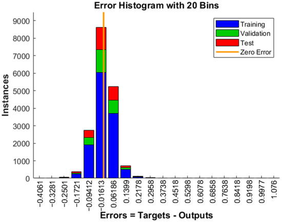 The error values indicate the degree to which the predicted values differ from the desired target values. The vertical axis (instance) represents the number of data samples, with the zero-error line corresponding to the zero-error value on the x-axis. The zero-error line on the diagram is around the value of −0.01613. There is a strong correlation between the predictions and the target, confirming that the preprocessing steps on the dataset, using the selected training model, were well-suited to the problem addressed in this paper.