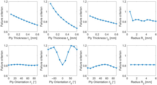 When aerospace structures of complex geometry are involved, the output may depend on numerous input parameters, and their individual effects should be ascertained. Similarly to [30], in the current study, a simple sensitivity analysis was also performed. A mean solution (with the value of each input parameter in the middle of the design space) was initially chosen, and then each parameter was independently varied within the allowed boundaries, and its effect on one of the outputs was estimated. Figure 13 illustrates the sensitivity of several inputs to the failure criterion. For solutions in the inner part of the inspected design space, it can be observed that all input parameters affect structural reliability, particularly ply thicknesses. As expected, ply orientation is very significant for unidirectional plies (here, in layer 4), and somewhat less meaningful for bidirectional plies (here, applied in layers 1–3, 5, and 6). The inspected hole radii appear less influential to failure criteria but affect maximal deformations more significantly. Therefore, for obtaining a satisfactory solution, one should consider the complete set of inputs and outputs, and a more detailed sensitivity analyses (applicable near the boundaries of the design space) will be performed in the future.