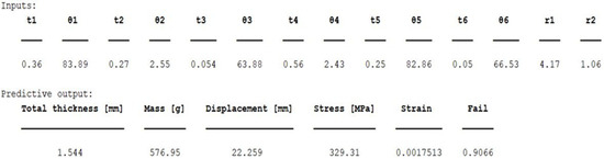 The created ANN model is used to predict six target variables: total thickness, mass, maximal displacement, stress, strain, and the structure’s failure factor coefficient, based on 14 input variables (layer thickness ti and orientations θi, respectively, and hole diameters R1 and R2). Input parameters are quantities that determine the nature of the output results. The thickness and orientation of the layers define the structure and affect the types of loads it can withstand. In addition, the layer thicknesses define the total mass of the structure, while the hole diameters R1 and R2 determine the geometric characteristics of the structure based on the specified type of loading.