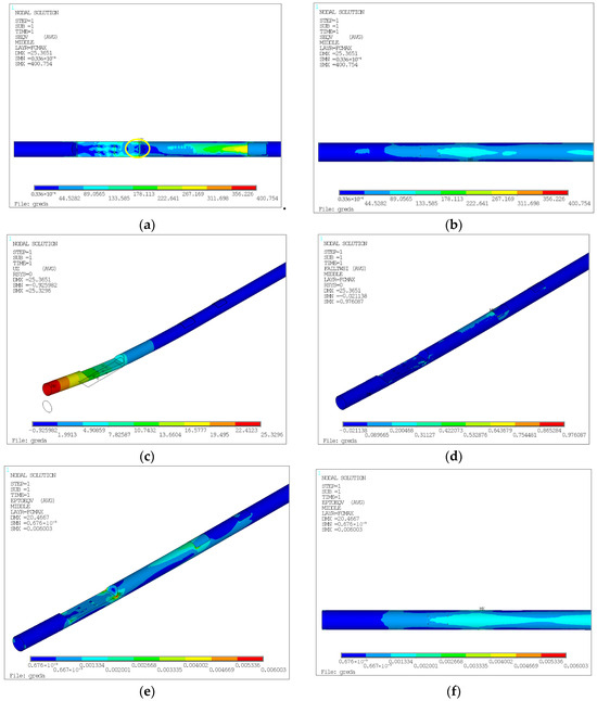 (a) Maximum stress for the entire laminate based on the failure criterion (top of the beam). (b) Bottom of the beam, with optimized hole sizes. (c) Beam displacement. (d) Failure factor coefficient for the entire beam. (e) Deformation of the beam (top). (f) Deformation of the beam (bottom).