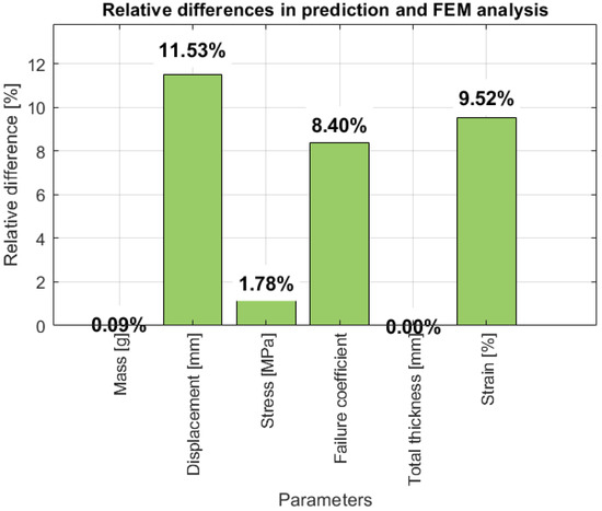 The relative differences between the output values obtained through prediction and the FE analysis are given in a table (Table 2) and also in a diagram (Figure 17).