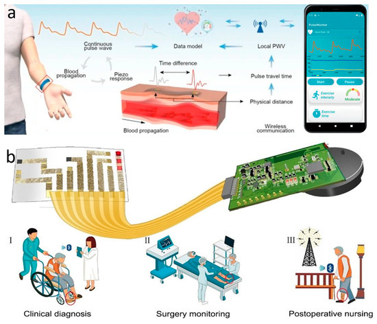 - Yi, Z.R.; Liu, Z.X.; Li, W.B.; Ruan, T.; Chen, X.; Liu, J.Q.; Yang, B.; Zhang, W.M. Piezoelectric Dynamics of Arterial Pulse for Wearable Continuous Blood Pressure Monitoring. Adv. Mater. 2022, 34, 2110291. [Google Scholar] [CrossRef]