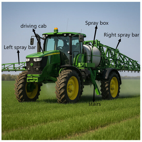 Technological advances in autonomous navigation of agricultural machinery are critical to address labor shortages, increase efficiency, and reduce environmental impact [1,2]. Large self-propelled plant protection machines (Figure 1) play a key role in crop management by reducing waste and environmental pollution through precise application of pesticides and fertilizers [3]. However, precise navigation of these machines in complex agricultural environments faces significant challenges due to changing terrain, obstacles, and dynamic conditions [4,5].