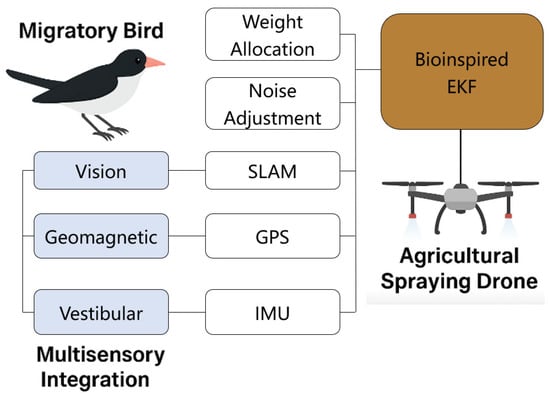 Migratory birds exhibit remarkable navigational abilities during migration, being able to travel across thousands of kilometers to reach their destinations with precision. This ability stems from their integration of multimodal sensory information from visual landmarks (e.g., mountains, rivers), geomagnetic fields, and somatosensory balance (e.g., acceleration and angular velocity perceived by the vestibular system) [19,20]. For example, under clear weather, migratory birds mainly rely on visual landmarks for localization; however, in cloudy or stormy weather, they dynamically adjust their strategies by increasing their reliance on geomagnetic fields or somatosensory sensations to adapt to environmental perturbations [21]. In this study, based on the above neuronavigation characteristics of migratory birds, a bionic extended Kalman filter (EKF) algorithm is proposed, with the following mapping relationship.