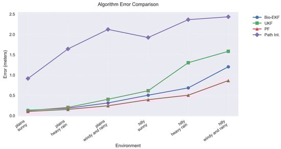 The error range of this paper’s algorithm in six environments is 0.39 m–1.20 m, which shows good environmental adaptability and robustness of perceptual fusion. Although the PF algorithm is slightly better than this paper’s algorithm in terms of error, the gap in most tests is not significant. In terms of the computational resource consumption, it is much higher than other methods. UKF performs slightly better than this paper’s algorithm in some highly nonlinear scenarios, but the lack of multi-sensor weight fusion capability causes its error to increase rapidly in harsh environments, up to 1.38 m. The path integral method, on the other hand, has consistently higher errors (up to 2.43 m) due to the absence of an external observation correction mechanism and expands rapidly with the terrain ups and downs and meteorological deterioration.