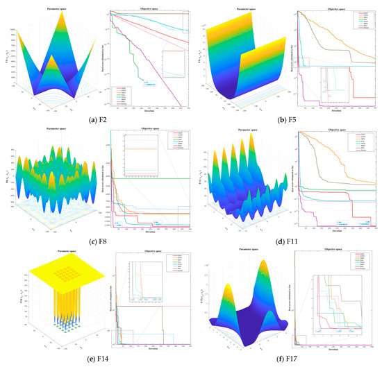 (1) Temporal Complexity: Compared with the standard GGO, the introduction of payoff matrix updates results in a temporal complexity of . When solving the ordinary differential equation in Equation (4), the complexity is . Additionally, performing mutation operations on k individuals incurs a temporal complexity of . Overall, although EGGO maintains the same order of temporal complexity as GGO, there is an increase in overall complexity. Considering that the total complexity of EGGO is , which aligns with mainstream algorithms, it is capable of meeting the demands for rapid optimization.