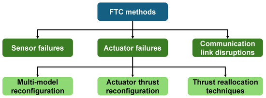 Depending on the failure modes, they can typically be categorized into three distinct types: actuator failures, sensor failures, and communication link disruptions [14], as shown in Figure 1. Among these categories, actuator fault-tolerant control constitutes a more thoroughly investigated domain, predominantly addressing thruster force degradation or rudder surface jamming [14,15,16]. Existing methods are generally classified into three primary categories. The first category involves multi-model reconfiguration, which establishes multiple predefined fault models with corresponding controllers and implements online switching to the most appropriate control law upon fault detection [17,18]. The second category focuses on actuator thrust reconfiguration strategies, which integrate dynamic models with advanced control algorithms by incorporating actuator fault severity levels into the control framework through thrust allocation modules [19,20,21]. The third category includes thrust reallocation techniques, which exploit system redundancy and employ methods to appropriately distribute generalized control forces [22]. Che developed a fault-tolerant control scheme for underactuated autonomous underwater vehicles (AUVs) with actuator faults by combining the backstepping method with single-criter network-based adaptive dynamic programming [23]. Li et al. proposed a robust adaptive fuzzy fault-tolerant control strategy for underactuated unmanned surface vessel (USV) formation tracking with multiple constraints and intermittent actuator faults, combining dynamic surface control with prescribed performance control techniques [24]. Chaos et al. presented a simple and robust fault-tolerant control scheme for AUVs under critical actuator failures, using only a single thruster with two control actions to guide the vehicle along a spiral-like path to a safe target point [25]. Jiang et al. investigated the fault-tolerant characteristics of a tripod parallel manipulator for underwater vectored thrusters through constraint screw theory analysis, and established an adaptive fault-tolerant control framework to handle actuator failures [26]. Wang et al. addressed time-varying thruster faults in autonomous underwater vehicles through an adaptive iterative learning observer that simultaneously estimated fault efficiency factors and overall disturbances for enhanced trajectory tracking control [27].