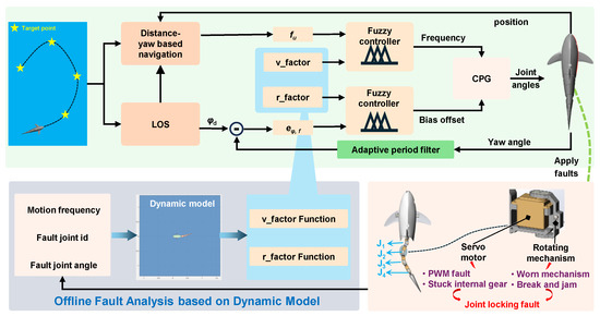 Based on the results of the aforementioned fault-tolerant analysis, we conduct the following controller in this section. Considering the highly nonlinear dynamic characteristics of robotic fish, a fuzzy logic-based following control method is proposed, incorporating the velocity influence factor and yaw influence factor obtained from the fault-tolerant analysis as key input parameters for the fuzzy rule. Furthermore, through the improved design of line-of-sight navigation algorithm and adaptive yaw filtering module, robust following control of the bionic robotic fish under fault types is achieved.