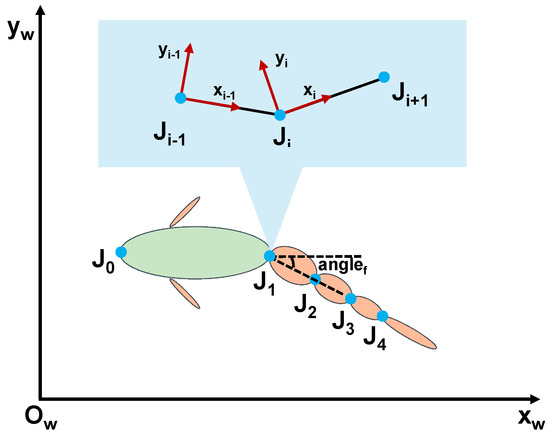 To accurately simulate the motion characteristics of a bionic robotic fish under fault types, we construct a motion model grounded in multi-joint dynamics theory. The robotic fish is abstracted as a serial structure consisting of a head joint followed by a four-link tail mechanism, as shown in Figure 3. Dynamic analysis is performed using the Newton–Euler formulation, and the details can be found in our previous work [31]. First, an inertial coordinate system is established as . For each segment of the robotic fish body, a corresponding body-fixed coordinate system is defined as . Here, refers to the head segment, and its origin is located at the foremost point of the fish. For the remaining segments, the origin of each local coordinate system coincides with the center of . The rotational displacement at is denoted by , where represents the yaw angle.