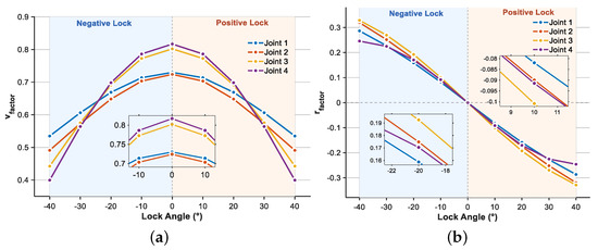 For further analysis, we fixed the swimming frequency at 1 Hz and focused on investigating the effects of different locked angles on the velocity influence factors of each joint, as shown in Figure 5a. The results demonstrate that , , , and achieve values of 0.730, 0.724, 0.802, and 0.817, respectively, at the 0° locked angle, representing the maximum values for each joint across the entire angular range. In contrast, under the −40° locked angle condition, the values of the four joints decrease to their minimum levels: 0.535 (), 0.491 (), 0.443 (), and 0.400 (). Comparative analysis reveals that during the angular transition from −40° to 0°, the improvement rates for the four joints are 36.4%, 47.5%, 81.0%, and 104.3%, respectively. This finding further confirms the critical role of the tail joint in the propulsive performance of robotic fish. Similarly, under the 1 Hz swimming frequency, the effects of different locked angles on the yaw influence factor are shown in Figure 5b. Regarding the variation amplitude, demonstrates the largest range of 0.658 (from 0.329 to −0.329), followed by with 0.640, while and show variations of 0.574 and 0.492, respectively.