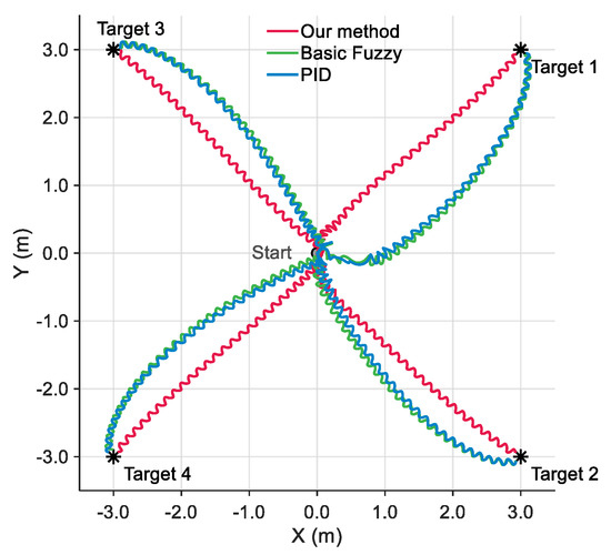 Figure 6 presents trajectory comparison results of the robotic fish navigating from the origin to target points in four quadrants under the fault type of locked at 40°. To validate the effectiveness of the proposed method, three comparative approaches are implemented. The Basic Fuzzy method does not apply velocity and yaw influence factors as inputs, relying solely on distance to destination and yaw angle error for feedback. The proportion–integration–differentiation (PID) method adopts a similar control strategy.