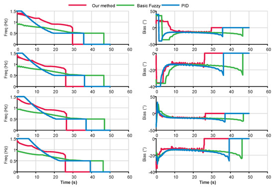 Figure 7 presents the simulation results of the and control signals. First, we examine the time at which the control signals decay to zero, which corresponds to the time of reaching the target points. The proposed method reaches the four target points at 29.78 s, 26.11 s, 26.49 s, and 25.88 s, respectively. In contrast, the Basic Fuzzy method requires 35.79 s, 36.23 s, 37.09 s, and 39.33 s, while the PID method takes 46.64 s, 46.66 s, 46.98 s, and 46.37 s. These results indicate that the proposed method achieves a performance improvement of 16% to 34% over the basic Fuzzy method, and 36% to 44% over the PID method. Regarding the bias output signals, all three methods are capable of generating correct control responses based on system feedback, with the proposed method demonstrating relatively superior responsiveness. However, it is worth noting that slight oscillations are observed in the bias signal of the proposed method. This phenomenon is mainly due to the fact that is a multi-variable function. Although the joint ID and locking angle remain constant during operation, the swimming frequency varies in real-time, inducing fluctuations and consequently introducing variations in the control output.