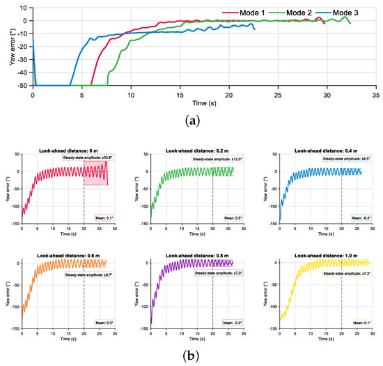 Based on this oscillation observation, additional simulations were conducted to optimize terminal control performance by adjusting the look-ahead distance parameter . The values of were set to [0, 0.2, 0.4, 0.6, 0.8, 1.0] m, and the system responses under each setting were systematically analyzed. To clearly illustrate the oscillation, Figure 8b presents the unfiltered yaw angle error data without upper and lower bound. The obtained results show that, when m, the system exhibits significant terminal oscillations, with a steady-state amplitude of . Introducing m markedly suppresses the oscillations, reducing the amplitude to . As increases, the oscillation amplitude continues to decrease. However, it is observed that the suppression effect saturates when exceeds 0.8 m. Moreover, an excessively large look-ahead distance implies overly anticipatory control actions, which may compromise system convergence. Therefore, the value of should be selected appropriately based on the task specific requirements.