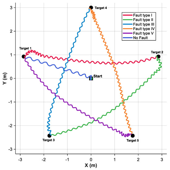 To evaluate the adaptability of the proposed method under various fault types, a pentagram waypoint following simulation was designed in this section. The simulation adopted Mode 1 input configuration for the velocity fuzzy rule and set the look-ahead distance to 0.2 m. The simulation results are illustrated in Figure 9. The robotic fish starts from the origin and sequentially passes through Target 1 to Target 5, ultimately forming a complete pentagram trajectory. The task consists of six following segments. The first segment (from the starting point to Target 1) is executed under fault-free conditions. Starting from Target 1, the system switches to a different fault mode at each subsequent target point. The specific fault configurations are detailed in Table 4. The primary challenge of pentagram waypoint following task lies in the requirement for large-angle turning maneuvers at each target point to accurately orient the robotic fish toward the next destination. The obtained results demonstrate that, under the proposed control method, the robotic fish successfully completes all segments. Furthermore, the impact of different fault types on the trajectory shape varies. For instance, faults in and cause more pronounced trajectory distortion, which aligns with the qualitative and above quantitative fault analyses. Despite the aforementioned influences, the deviations induced by each fault type are effectively mitigated through the proposed fault-tolerant control strategy, highlighting the method’s effectiveness in maintaining accurate following under adverse conditions.