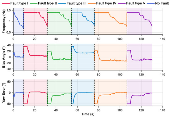 To further analyze the dynamic response characteristics of the system during pentagram waypoint following task, Figure 10 presents the time-domain response curves of the control frequency, bias angle, and filtered yaw error angle. The entire following process is divided into six segments, each marked with a different background color to distinguish between the fault-free condition and the five distinct fault modes. The bias angle result indicates that the system possesses a rapid adjustment capability during target point transitions, with all bias angles eventually converging to around 0°. It is important to note that a yaw error limit of was imposed to enhance the precision of fuzzy control. At the moment of fault mode switching, the system exhibits highly coordinated adjustment behavior. The control frequency and bias angle respond in near-synchrony, and transient fluctuations in yaw error are effectively suppressed within acceptable bounds. Therefore, despite the presence of different fault constraints, the control performance across all segments remains relatively consistent. This further validates the proposed method’s stability under multiple fault types. However, since the employed control strategy focuses on waypoint following rather than strict path following, minor deviations from the ideal straight-line trajectory are observed in some segments.