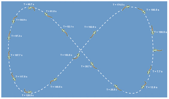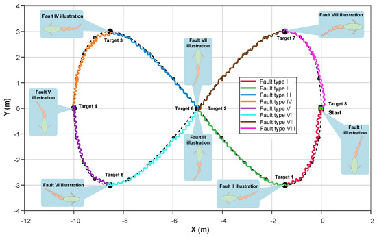 Similarly, a fault mode transition was introduced at each target point during this simulation. A diverse set of fault configurations was applied, with graphical representations of the specific fault type shown in Figure 12. To achieve a smoother and more continuous path-following performance, three intermediate reference points were uniformly inserted between every two target waypoints. The simulation results indicate that, under the proposed control strategy, the robotic fish successfully completed the full figure-eight path-following task. The resulting trajectory closely matches the figure-eight curve. The introduction of intermediate reference points improved the smoothness and continuity of the following path. As illustrated in the fault diagrams, different fault types introduce considerable changes to the fish’s body configuration. Notably, although the system experienced eight different fault modes across the eight following segments, including various joint locking faults and combinations of different locking angles, the robotic fish consistently adapted quickly after each fault transition and maintained stable following performance. The system demonstrated particularly good performances near the intersection points of the figure-eight path and in regions with high curvature variation. The symmetry and geometric integrity of the overall trajectory were well preserved throughout the experiment, further confirming the practical applicability of the proposed fault-tolerant control algorithm.