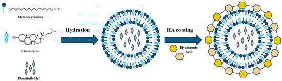 Schematic illustration of the preparation and surface modification of dasatinib-loaded sterosomes (HA-St-Das). Sterosomes were prepared using a thin-film hydration method with octadecylamine and cholesterol as the main lipid components and dasatinib hydrochloride (Das-) as the encapsulated drug. The resulting unilamellar vesicles encapsulate dasatinib within the hydrophobic bilayer. Subsequently, hyaluronic acid (HA) was coated onto the sterosome surface to improve colloidal stability, enhance biocompatibility, and enable active targeting of CD44-overexpressing hepatocellular carcinoma (HCC) cells.