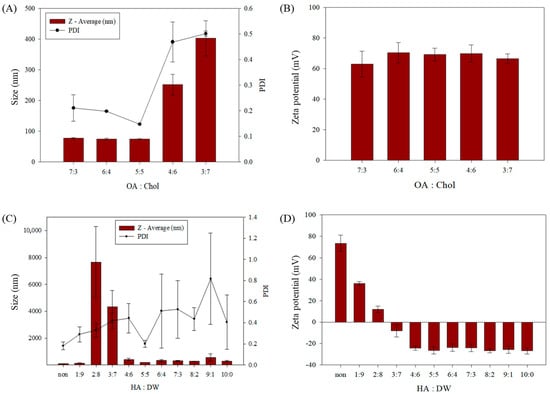 Characterization of sterosomes prepared with various OA:Chol ratios. (A) Particle size and polydispersity index (PDI); (B) zeta potential values. Characterization of HA-St-Das nanoparticles prepared with varying ratios of 1.0 mg/mL HA and distilled water (DW). (C) Particle size and polydispersity index (PDI). (D) Zeta potential. Data represent the mean ± standard deviation (SD) of three independent experiments (n = 3).