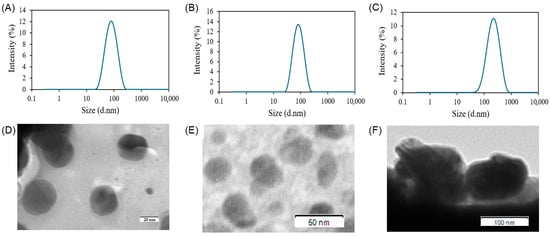 Dynamic light scattering (DLS) profiles and transmission electron microscopy (TEM) images of (A) empty sterosome, (B) St-Das, and (C) HA-St-Das. The size distribution and polydispersity index (PDI) were determined by DLS. Representative TEM images of (D) empty sterosome, (E) St-Das, and (F) HA-St-Das present the morphology and relative size of the nanoparticles. Scale bars in TEM images represent (D) 20, (E) 50, and (F) 100 nm. Data are presented as mean ± SD from three independent experiments (n = 3).