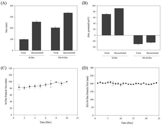 To investigate long-term storage stability, both St-Das and HA-St-Das were freeze-dried in the presence of 5% (w/v) sucrose as a cryoprotectant. The lyophilized samples were stored at −20 °C for one month and then reconstituted in distilled water for analysis. After reconstitution, both formulations exhibited increased particle sizes but retained their nanoscale characteristics. The reconstituted particle sizes were 255.4 ± 10.2 nm for St-Das and 336.3 ± 2.6 nm for HA-St-Das, while zeta potentials were 90.9 ± 0.2 mV and −24.4 ± 1.5 mV, respectively (Figure 4A,B). These results confirm that both formulations maintained colloidal integrity after one month in frozen storage and subsequent lyophilization.