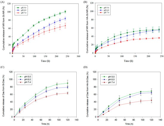 In vitro drug release profiles of the (A) St-NR, (B) HA-St-NR, (C) St-Das, and (D) HA-St-Das. Measurements were obtained from three independent experiments (n = 3). Data in graphs are expressed as mean ± SD.