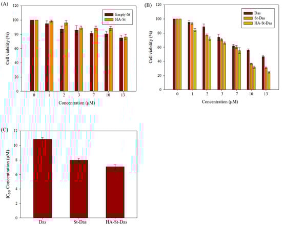 The IC50 values of Das, St-Das, and HA-St-Das were determined from the MTT assay data to enable comparative evaluation of cytotoxicity among the different formulations.