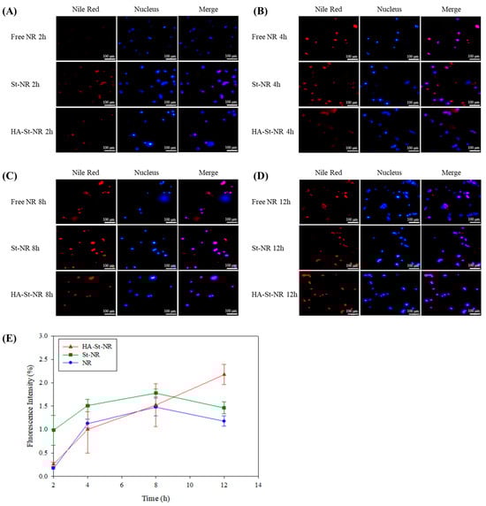 Fluorescence images confirming the uptake of free Nile Red (NR), St-NR, and HA-St-NR in HepG2 cells at (A) 2 h, (B) 4 h, (C) 8 h, and (D) 12 h. Scale bar: 100 µm. Red fluorescence indicates Nile Red in the sterosomes (Nile Red was used as a model drug encapsulated within the sterosome); blue fluorescence indicates Hoechst 33342 nuclear staining. (E) Quantitative fluorescence intensity profiles of NR, St-NR, and HA-St-NR in HepG2 cells at (A) 2 h, (B) 4 h, (C) 8 h, and (D) 12 h. Fluorescence intensity was quantified using ImageJ software from the microscopic images, and data represent the mean ± SD of three independent experiments (n = 3).