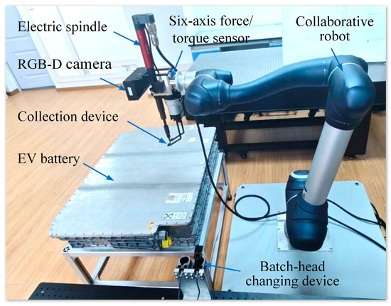 Due to environmental protection and resource conservation, the disassembly of end-of-life (EoL) electric vehicle (EV) batteries has drawn extensive attention as a key step in recycling and remanufacturing for a circular economy. Given the inefficiency, high costs, potential health risks, and various challenges associated with traditional manual disassembly, robotic disassembly and human–robot collaborative disassembly technologies have been increasingly developed and employed [1,2]. Robotic disassembly has been extensively researched and applied across multiple domains. In electronic product disassembly, cognitive robotic technology was developed for processing various product models [3]. This approach significantly enhanced the flexibility and adaptability of the disassembly process. For the disassembly of small fasteners, a vision-based robotic strategy for hex screw removal was proposed that incorporated camera pose adjustment, screw pose calculation, and coordinated motion planning between the robot and tools to achieve highly efficient and precise screw disassembly [4]. It provided an effective solution for handling the large number of screw removal tasks in electronic products.