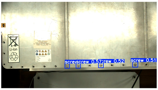About 2500 images of screws in EV batteries were collected under different lighting and background conditions. The size of each image was 1408 × 1024 pixels. To enhance the model’s generalisation ability and the dataset’s diversity, data augmentation techniques, including cropping, stitching, mirror transformation, greyscale conversion, brightness adjustment, and noise addition, were applied to process the original images, thereby preventing the model from overfitting. After screening, 2000 images were retained and divided into a training set (1600 images) and a validation set (400 images) with a ratio of 4:1. The LabelImg image annotation tool was used to label both the training set and the validation set accurately. Figure 2 shows the image after recognition. The type, position, and depth information of the screws in an EV battery could be obtained using a vision system.