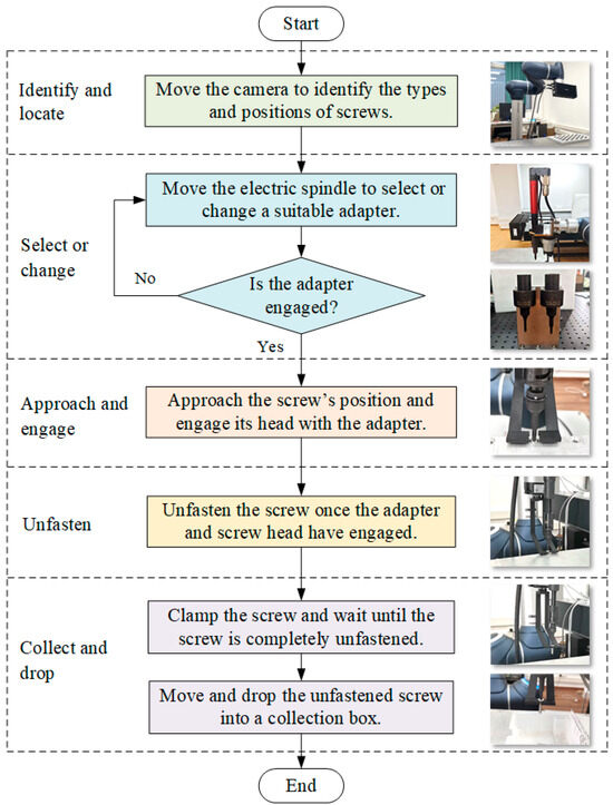 The screws in EV batteries could be automatically recognised, located, loosened, and collected using a robot equipped with machine vision, an electric spindle, a batch-head changing device, and a collection device. Figure 4 illustrates the developed process for robotic unfastening and collecting a screw, comprising five stages: identify and locate, select or change, approach and engage, unfasten, and collect and drop.