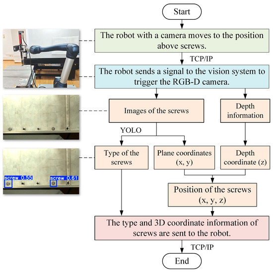 A flowchart of the recognition and localisation of screws based on machine vision is shown in Figure 5. Firstly, the robot, equipped with a 3D camera, moves to a position above the screws in an EV battery. Then, the robot sends a signal to the vision system to trigger the camera to capture images of and depth information on the screws. The TCP/IP protocol is employed between the robot and the vision system. ML algorithms like YOLOv8 are used to analyse the images and obtain the type and plane coordinates (x and y) of the screw. The depth coordinate (z) could be obtained by using the depth information. Finally, the type and 3D coordinate information of the screw are sent to the robot.