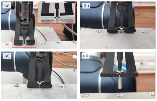 Figure 6 illustrates the process of clamping and dropping the screws using a self-developed collection device. The collection device has a two-finger gripper. In its initial state, the collection device is open during the electric spindle searches and engages with the screw head, as shown in Figure 6a. The bottom surface is 2–5 mm away from the bottom surface of the screwdriver in the positive direction of the Z-axis (the bottom surface of the clamping device is higher than the screwdriver), avoiding interference and collision. After the screw exits the threaded hole with sufficient clearance (Figure 6b), the collection device clamps the screw and tracks its movement. Once the screw is completely out of the threaded hole, the robot with the collection device moves and drops the unfastened screw into a collection box, as shown in Figure 6d.