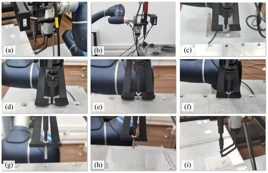 Based on the above settings, an experiment was designed to investigate the disassembly of screws. Figure 8 presents the images taken of the entire process of unfastening and collecting screws from the battery top cover. Figure 8a shows that the robot moved to the photo-taking position above the battery, where the images and depth information of the screws were captured using the camera in the vision system. Based on the type information of the screw, the robot moved the electric spindle to select a suitable adapter, as shown in Figure 8b. Then, the robot approached the position of the screw to be dismantled, as shown in Figure 8c. Figure 8d shows that the adapter engaged with the screw head. The screw is shown unfastening in Figure 8e, and the screw moved out of the threaded hole. Figure 8f shows that the collection device clamped the screw, and Figure 8g shows that the screw was completely moved out of the threaded hole. The unfastened screw was moved to a position above the collection box, as shown in Figure 8h, and dropped into the box when the gripper of the collection device was opened (Figure 8i).