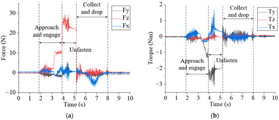 Figure 9 shows the 6-DOF (degree of freedom) dynamic forces and torques measured by the six-axis force/torque sensor installed between the robot and the electric spindle during the unfastening and collecting processes. Figure 9a,b display the 3-DOF forces and 3-DOF torques, respectively. It can be seen that the approaching and engaging stage occurs from 1.9 s to 3.9 s. During the robot’s approach to the screw position, the 3-DOF forces fluctuate between −3 N and 5 N, and the 3-DOF torque fluctuates between −0.5 Nm and 0.5 Nm. The robot applied a force in the -Z direction, and the electric spindle did not rotate. Then, the electric spindle rotated in the direction of tightening the screw at a speed of 43.6 rpm, searched in a spiral motion, and engaged with the screw head. The magnitude of Fz is around 10 N, and the torque Ty fluctuates around 1 Nm. The unfastening stage spans from 3.9 s to 5.2 s, during which the electric spindle rotates in the unfastening direction at a speed of 436 rpm. The magnitudes of Fz and Ty are around 25 N and −2.5 Nm, respectively. The collecting and dropping stage occurred between 5.2 s and 8.1 s.