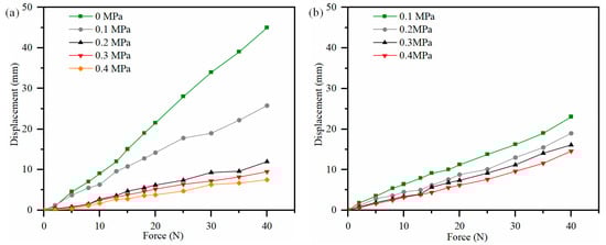 To calculate the stiffness of the stretched PAM, the experiment was repeated four times under five supply air pressures (0 MPa, 0.1 MPa, 0.2 MPa, 0.3 MPa, and 0.4 MPa), with the average value taken. The experimental results regarding the mechanical properties of the PAM are presented in Figure 2. Specifically, Figure 2a shows the experimental results of how the PAM length varies with different additional loads under a specific inflation pressure, while Figure 2b illustrates the variation in PAM stiffness as the supply air pressure increases. It is evident from the above figures that the contracted PAM exhibits greater stiffness than the stretched PAM. Experiments were also conducted to investigate the relationship between internal pressure and PAM length under no-load conditions. The results confirmed that the maximum length of the stretched VSPAM could reach 45 cm at a pressure of 0.4 MPa, which means its effective length was 13% longer than that in its natural resting state (without pressure application). The kinematic modeling of VSPAM is presented in the Supplementary Materials.