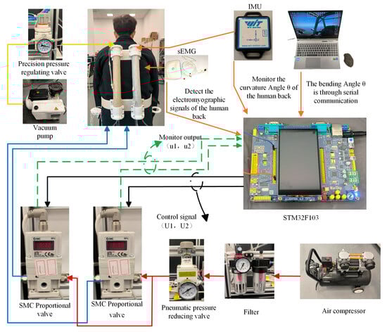 To better control the assisting process of the lumbar spine-assisted exoskeleton robot and capture the real-time back bending angle of the human body, a nine-axis Bluetooth posture angle measurement sensor (BWT901CL) is installed at the end of the variable stiffness actuator. Real-time data transmission is achieved via Bluetooth, enabling monitoring of the movement direction and speed of the lumbar spine-assisted exoskeleton robot. Figure 3 presents the system integration framework of the lumbar spine-assisted exoskeleton robot. The hardware system of the robot comprises an air compressor, SMC electric proportional valves, analog converters, posture angle measurement sensors, a vacuum pump, a laptop computer, an STM32F103 minimum system board, and a 24 V power supply.