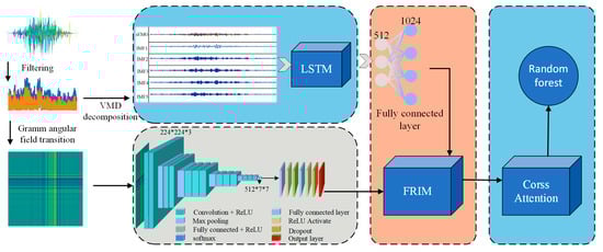 The back movement intention recognition model in this study adopts a two-branch structure using raw sEMG data. Based on the waveform data, the one-dimensional sequence is converted into a two-dimensional Gram angle field image. One branch involves inputting the GAF into VGG16 for image feature extraction; the other branch processes the sEMG signal waveform through Variational Mode Decomposition (VMD) combined with the Welch method [18]. To obtain time-domain and frequency-domain features, these features are combined to form a flattened feature vector. Subsequently, sequence information is captured via LSTM, and the output of LSTM is converted to the same dimension as the image features through a fully connected layer. Finally, the image features and signal features are subjected to the Fine-grained Relationship Inference Module (FRIM) to form fused features. And then through the Cross Attention mechanism [19,20,21] used to enhance the representativeness of the features. Finally random forests are used for classification. Figure 4 shows the flowchart of the recognition algorithm.