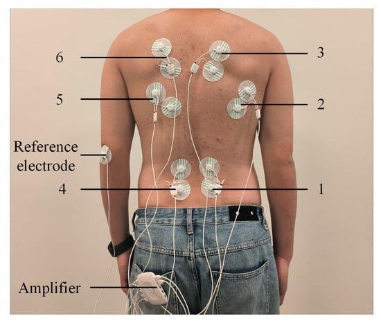 The experiment was conducted by eight healthy participants, none of whom had a history of bone diseases. Their ages ranged from 20 to 35 years old, and their heights were between 160 cm and 185 cm. The experiment utilized 6 analog channels and 1 ground port, thus requiring 6 sEMG sensors and 13 electrode patches. Prior to the experiment, sEMG sensors 1 to 6 were attached to the human back as shown in Figure 5, with the reference electrode affixed to the wrist. To facilitate subsequent analysis and preprocessing of the experimental data, the 6 muscles and their corresponding 6 sEMG sensors are named as follows: sEMG sensors 1 and 4 correspond to the left and right erector spinae muscles of the back; sEMG sensors 2 and 5 correspond to the left and right latissimus dorsi muscles of the back; and sEMG sensors 3 and 6 correspond to the left and right trapezius muscles of the back.