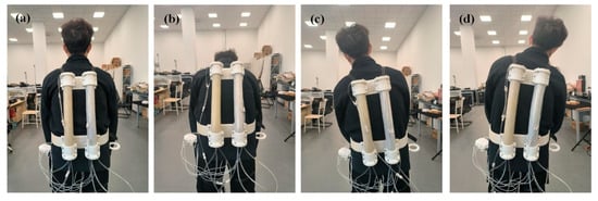 Volunteers wear lumbar spine to assist electromyographic signal acquisition experiments. (a) Upright condition. (b) Anterior lateral flexion. (c) Left lateral flexion. (d) Right side bending.