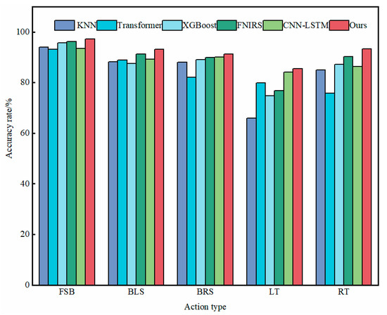 To evaluate the performance of the proposed VGG-LSTM model in sEMG signal recognition, we conducted a comparative analysis with multiple benchmark classifiers, encompassing both classical and state-of-the-art algorithms. Specifically, the selected classifiers include K-Nearest Neighbors (KNN), eXtreme Gradient Boosting (XGBoost), Transformer [23], Functional Near-Infrared Spectroscopy (FNIRS)-based methods [24], and CNN-LSTM [15]. The comparative results are presented in Figure 10.