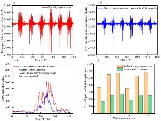 Raw data were acquired based on human back sEMG signals. The sEMG signals were selected and preprocessed, and the preprocessing results are shown in Figure 11a,b, which illustrate the sEMG signals when wearing and not wearing the exoskeleton. For anterior lateral flexion movements, the sEMG signals exhibit significant changes. The intensity of the collected sEMG signals on the back can reflect the magnitude of muscle movement, i.e., to a certain extent, the degree of muscle contraction or relaxation. After collecting relevant data using the sEMG sensor and performing corresponding data processing, the collected values of back sEMG signals from the six back muscles before and after assistance can be obtained. During human back-bending movements, the amplifier captures changes in sEMG intensity and converts them into corresponding values. These values are quantified using a power value w, which is used to visualize the strength of the sEMG signal.