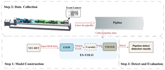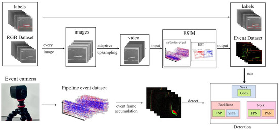 ES-YOLO consists of the ESIM module and the YOLOv8s module. This section introduces the ESIM module and the YOLOv8s module. First, the RGB dataset is upsampled to convert it into a high-frequency dataset. Second, the ESIM module is used to synthesize event dataset. Finally, the YOLOv8s model is trained using the N-neudet event dataset, and defect detection is performed on actual pipelines.