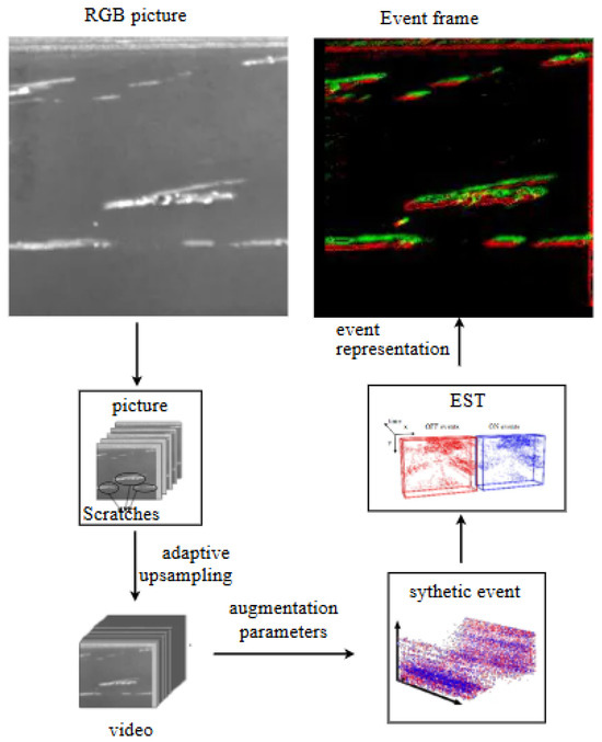 For the experiments, we selected the NEU-DET dataset [42], which contained six typical surface defects of hot-rolled strip steel: Roll Scale (RS), Patches (Pa), Cracks (Cr), Pitted Surface (PS), Inclusions (In), and Scratches (Sc). The dataset consisted of 1800 images, with 300 samples per defect type, and included detailed annotations specifying both the defect categories and their locations. After selecting the NEU-DET dataset, we processed it through the ESIM module to generate a synthetic event-based defect dataset, which we named N-neudet. This event dataset was subsequently used to train the YOLO-based defect detection model, allowing for the evaluation of the model’s performance across different defect categories. As a result, a total of 1800 event defect images were generated, containing six different types of typical defects, with 300 samples for each defect type. The conversion process from RGB images to event frames is illustrated in Figure 4.