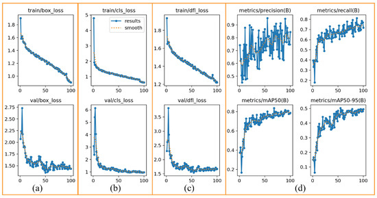 Training result figures. (a) The bounding box loss (box_loss), which measures the error in predicted object locations, shows a consistent downward trend, indicating that the model is effectively learning to locate objects; (b) the classification loss (cls_loss), indicating the error in predicting the correct object class, also steadily decreases as training progresses; (c) Distribution Focal Loss (dfl_loss), another component for bounding box regression, follows a similar convergence pattern; (d) Key evaluation metrics, showing the progression of precision, recall, and mean Average Precision (mAP), all exhibit a clear upward trend, signifying significant performance improvement over time.